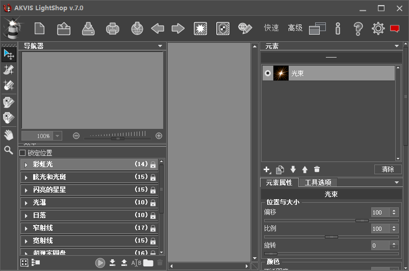 AKVIS LightShop是一款强大的灯光滤镜渲染软件,该软件是一个独立运行的软件,如果用户需要也可以在PS等图像软件中使用它;这款软件的主要功能是帮助用户在图像中添加灯光或星星效果,软件为用户提供了几十种不同的灯光效果,用户可以直接使用;使用AKVIS LightShop所创建的灯光效果会很自然,几乎看不出这些光效果是通过软件创建的;您可以在处理图像的过程中自定义灯光效果的比例、旋转、不透明色、亮度、随机长度、光晕宽度等等,这一切都可以按照您个人的喜好而改变;最重要的是这款软件支持中文,所以国内用户无需汉化也能轻松使用。