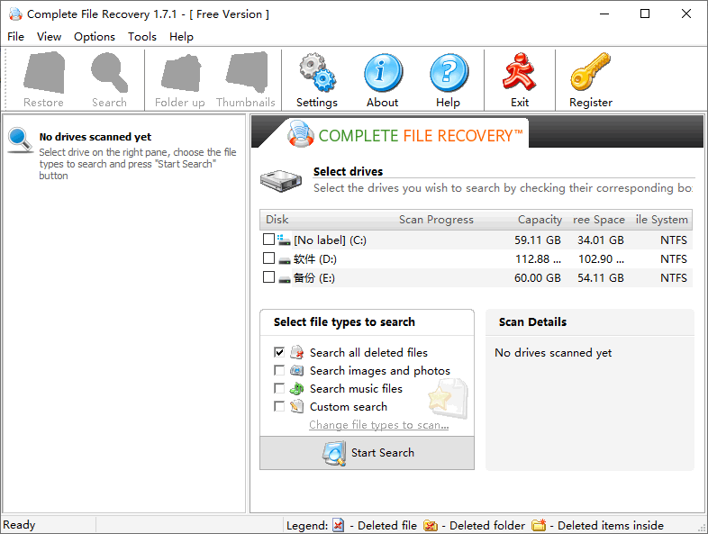Complete File Recovery是一个通用的文件恢复软件,用户可以使用这款软件从硬盘、USB闪存驱动器、CD/DVD磁盘等等存储设备中恢复被删除的文件数据,包括在回收站中被清空的数据都可以使用它轻松恢复;它可以恢复的文件类型包含数码照片、图像、文档文件、音乐、邮件数据库等等;Complete File Recovery非常轻便,它无需安装,因此用户可以将它保存到USB闪存盘中,这样用户便可以随时在任何电脑上恢复用户需要的数据;软件拥有搜索和预览等功能,能够在用户查找文件时提供帮助。