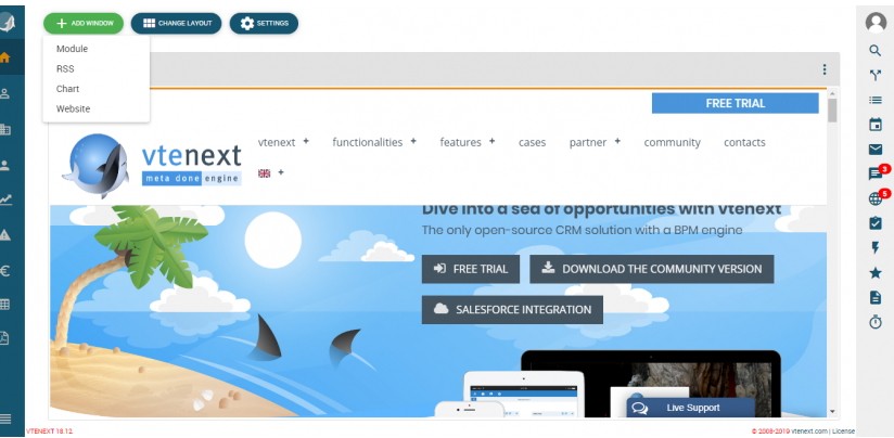 右侧的功能栏(对话,通知,快速创建等)包括指向过程模块和搜索功能的链接。