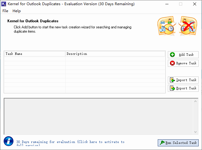 现在,您再次拥有“ Outlook重复项内核”的主窗口。 从任务面板中选择要运行的任务,然后单击立即运行所选任务按钮。
