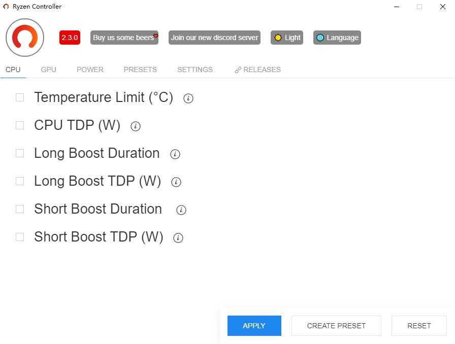 Ryzen Controller是一款功能强大、简单专业的CPU管理软件,使用这款软件用户可以对CPU温度墙、功耗等参数进行设置,可以通过简单便捷的设置即可释放系统原有性能,帮助用户调整电脑CPU运行,让电脑始终保持最佳运行状态; Ryzen Controller 支持CPU、GPU以及电池管理等自定义预设,当你需要额外的功率时点击预设即可启用,非常简单方便,目前大多数的电脑都没有用于调整CPU、GPU等处理器性能的工具,因此下载并使用Ryzen Controller这款CPU管理控制软件,可以有效解决这一问题。