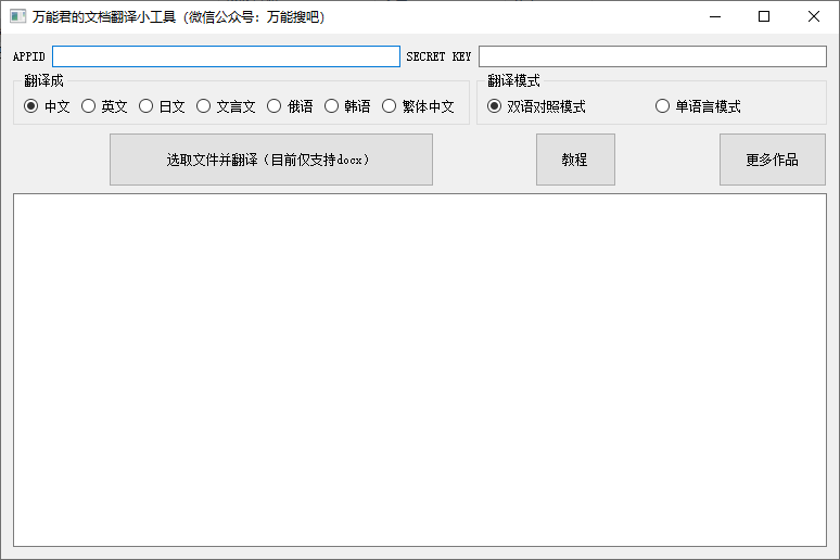 万能君的文档翻译小工具是网友自制的免费文档翻译软件,用户可以通过它翻译docx文档中的内容,可将文档内容翻译成中文、日文、英文、文言文等;尽管市面上的翻译软件有很多,但大多数软件都只能翻译简单的单词或句子,可翻译的字数有一定限制;而这款万能君的文档翻译小工具则是针对翻译文档而开发的,它可以翻译整篇docx文档;在使用这款软件时需要用户自行到百度AI申请百度翻译的APPID和SECRET KEY,由于公共的APPID和SECRET KEY容易过期,因此让用户自行配置就可以避免软件在使用一段时间后就无法使用的问题。