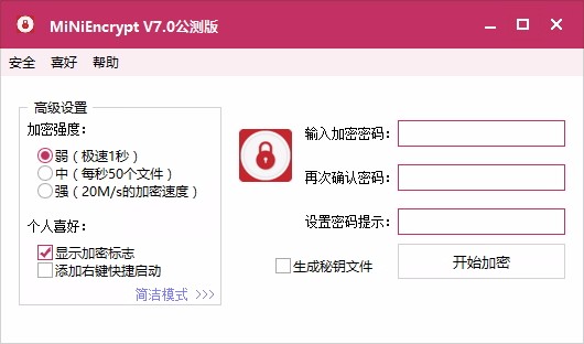 可自定义设置加密密码以及密码提示,还可生成秘钥文件