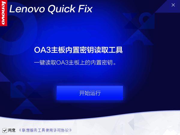 4、提示“本工具仅用于从联想OA3主板上读取内置的产品密钥,读出来的产品密钥不能用于安装操作系统,请了解”点击确定开始获取主板秘钥。