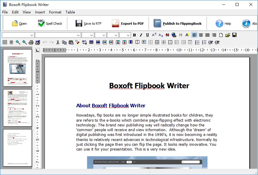 Boxoft Flipbook Writer是一款体积轻量、专业实用的翻页电子书制作软件,通过该软件用户可以快速浏览编辑电子书以及翻页书等,用户只需将电子书文件添加到软件上即可进行浏览编辑,该软件内置有多种简单实用的电子书编辑工具,可对电子书文字进行字体样式、颜色、大小等进行设置,用户可以根据需要设置编写喜欢的电子书和翻页书;Boxoft Flipbook Writer界面干净整洁、操作简单方便,可将编辑好的电子书导出为RTF或pdf文件,同时还可以将发布到具有翻页效果的翻页书中,便于用户动创建各种专业精美的翻页电子书,有需要的用户可以自行下载使用。