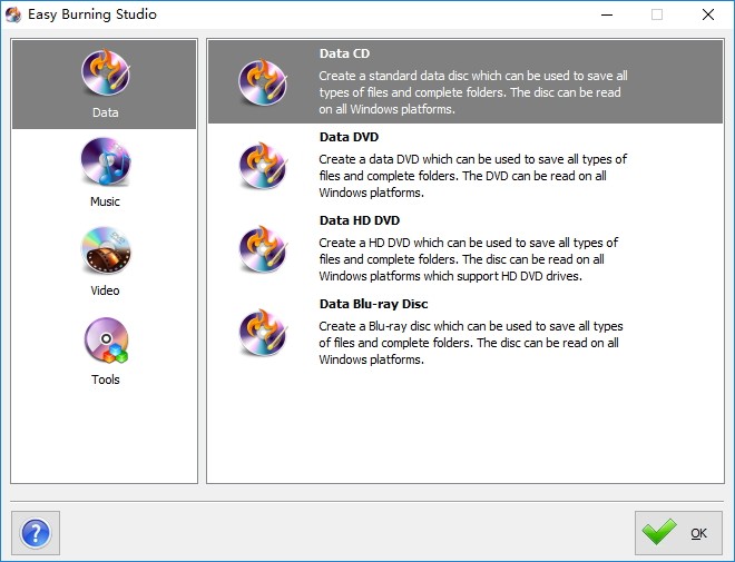 Easy Burning Studio 是一款体积轻量但功能强大的光盘刻录软件,该软件支持几乎所有数字格式的刻录,通过该软件用户可以对视频、音频等文件进行刻录,用户可以自由选择刻录方式将选择的文件刻录到DVD中,非常的简单方便;Easy Burning Studio 页面简洁美观、操作简单便捷,使用这款光盘刻录软件,用户可以对Data、Music、Video、Tools等文件进行刻录,同时用户可以对刻录的文件进行数据提取和数据信息查看,对于经常需要进行光盘刻录的用户不妨下载软件试试吧。