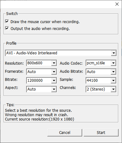 7、下图是屏幕录制的配置窗口,你可以在该窗口设置视频的输出尺寸,输出质量以及输出格式。