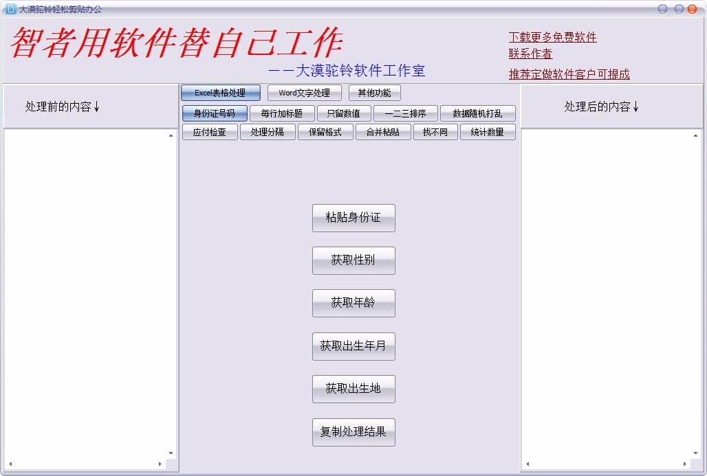 目前有的功能是批量处理身份证号码运算出性别、年龄、出生年月、出生地等,而这些如果要用Excel处理,可能要用到比较复杂的公式。