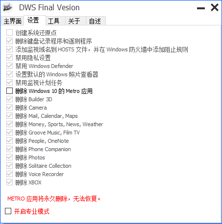 3、当您勾选“删除Windows10的 Metro应用”后,您就可以自定义选择下方的这些功能。
