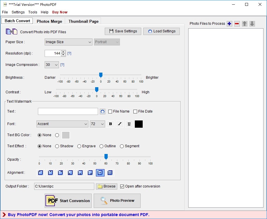 PhotoPDF是一款可以将图片转换为PDF图片的强大软件,使用这款软件用户可以将常用的图片格式转换为pdf文件,同时该软件还支持PDF水印添加功能,可以对转换成PDF文件进行水印添加,该软件支持文字水印添加和图片水印添加,用户可以自由设置文字水印和图片水印,可让用户灵活便捷的进行转换图片的水印添加;PhotoPDF支持图片合并功能以及缩略图转换功能,可让用户可多个图片合并为一个PDF文件,可以将选择的图片转换成缩略图,非常简单方便,有需要的朋友可以下载使用。