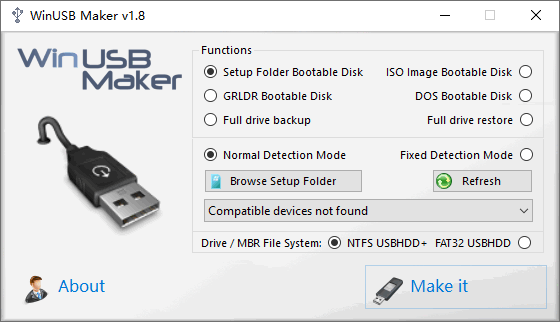 WinUSB Maker是一款免费的系统启动盘制作软件,用户可以通过这款工具在USB中创建文件夹启动盘、镜像文件启动盘、GRLDR以及DOS启动盘;启动盘一般用于系统恢复或系统安装,如果用户要在计算机没有网络或无法正常打开的情况下重装系统,那么系统盘就是安装系统唯一的办法,由于USB易于携带,因此很多用户也喜欢将USB制作成系统启动盘;WinUSB Maker的操作方式比较简单,虽然软件界面是英文,但由于需要配置的选项不多,所以也不会对用户造成很大的使用障碍;需要朋友赶紧下载吧。