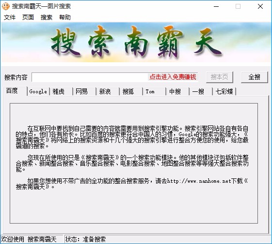搜索南霸天图片搜索工具是一款非常专业且优秀的图片搜索软件,顾名思义通过该软件可帮助用户快速搜索需要的图片,简洁直观的软件界面加上简单的操作,任何类型的用户都能轻松进行图片搜索,只需输入搜索内容并选择搜索引擎一键即可在指定的搜索引擎中搜索需要的图片,搜索完成后即可在软件界面查看搜索到的图片,选择需要的图片可将其保存在本地,便于后续使用,不仅可以按照指定的内容进行搜索,还可以搜索与内容相关的图片,这么好用的软件赶快下载试试吧!
