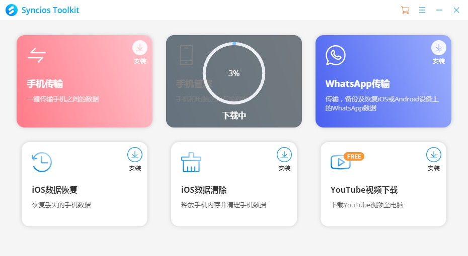 Syncios Toolkit是一款功能强大、简单易用的移动安全程序管理软件,该软件内置手机传输、手机管家、WhatsApp传输、iOS数据恢复、iOS数据清除、YouTube视频下载六大应用程序,点击即可下载使用,无需安装,可帮助用户快速进行手机数据恢复备份、数据管理等操作;Syncios Toolkit界面简洁美观、操作简单便捷,可帮助用户轻松管理Android和iOS设备,且该软件内的所有程序拥有完善的设备管理解决方案,可以有效解决用户系统遇到的各种问题,可以说是一款非常专业强大的移动设备管理软件。