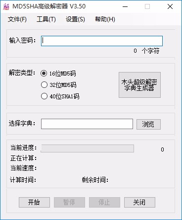 MD5SHA高级解密器是一款非常专业且优秀的解密软件,通过这款软件可帮助用户快速进行解密操作,整体的解密流程十分轻松,输入密码后选择解密类型以及字典,一键即可开始进行解密,软件提供了不同的解密类型,包括16位MD5码、32位MD5码以及40位MD5码,在解密的过程中可查看当前的解密进度,还可查看当前速度并计算解密时间,您也可以随时暂停或停止解密进程,使用起来非常方便,同时软件还支持计算密码,总的来说该软件为用户提供了完美的解密方案,欢迎有需要的用户下载体验