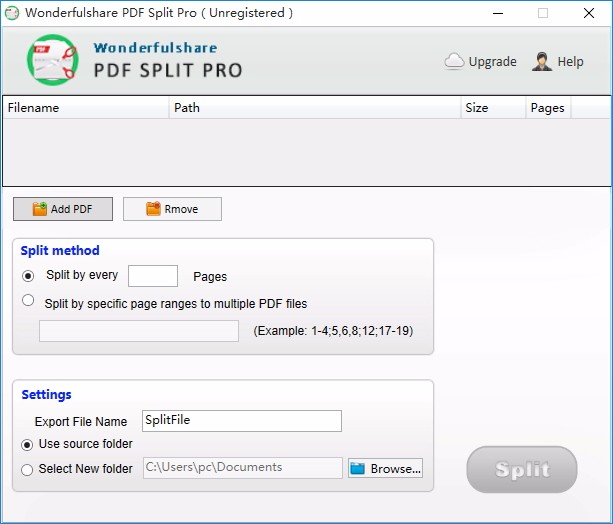 首先,您会注意到它的紧凑主窗口和WonderfulShare PDF Split Pro的简单界面,这很明显是一个单一用途的应用程序。除了必须显示的功能外,您还可以打开右键单击菜单以获取其他选项。