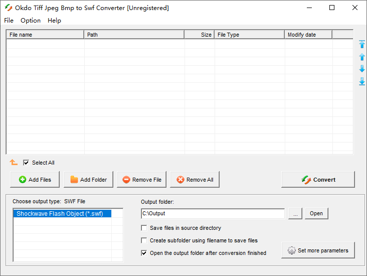 6、由于软件默认仅支持将图片转换成swf文件,因此无需选择文件格式,直接设置输出路径。