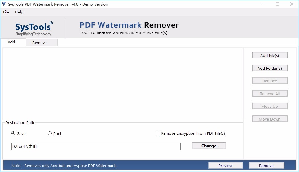 Remover是一款非常简单且实用的PDF去水印工具,顾名思义通过这款软件可帮助用户快速将PDF水印进行去除,我们在阅读PDF文件时若有的重点内容或需要查看的内容被水印遮挡,这就很影响我们的阅读体验,这时候就可以用到这款软件,软件对应的去水印操作非常简单,您只需添加PDF文件并设置输出目录,一键即可进行去除,在去除水印前可预览处理后的PDF文件,达到您满意的效果后再去除水印,同时软件还提供了打印功能,欢迎有需要的用户下载体验