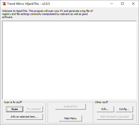 3、按需在这几个选项中选择您需要执行的操作,包括进行系统扫描并保存日志文件、仅执行系统扫描、查看备份列表、打开“杂项工具”部分和在线打开HijackThis快速入门。