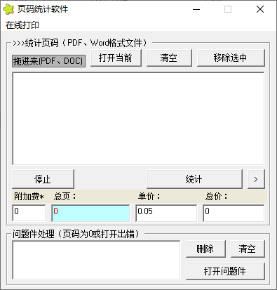 页码统计软件是一款简单易用的PDF和doc页面统计和费用计算工具,通过该工具可以快速统计PDF或doc文档所包含的页面数量;用户可以直接将需要统计的文档拖放到软件中,然后仅需一键即可快速获得对应的页面数量和相关费用;一般打印和制作PDF都是按页收费的,一些PDF的页数比较多,如果一页页的查看会比较麻烦,而使用这款工具的话不仅可以快速统计文档页数,还可以自动计算出文档制作或打印的总费用;需要的朋友赶紧下载吧。