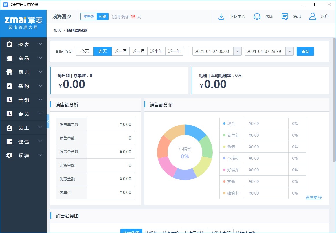 超市管理大师是一款功能丰富齐全、专业实用的超市管理软件,由四川掌麦科技有限公司完全自主研发、倾力打造,主要以移动智能化管理和营销为主,适用于中小型个体及连锁超市管理,该软件界面干净整洁、操作简单便捷,能够满足超市专业化管理的基本需求;超市管理大师内置报表、商品、网店、采购、营销、会员、员工、钱包以及系统等九大操作功能模块,拥有先进的云数据存储技术以及全套完善的超市经营管理解决方案,为商家提供专业安全、高效便捷的超市管理。