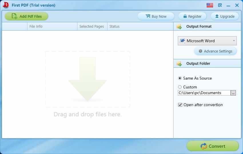 First PDF是一个易于使用的程序,可让您将PDF文件转换为Microsoft Word支持的文档(DOC格式)或纯文本文件(TXT文件类型)。但是,您也可以将其转换为具有以下扩展名的图像:PNG,JPEG,GIF,BMP,TIFF和多页TIFF。