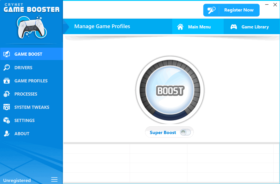 Crynet Game Booster是一款强大的游戏优化管理软件,它支持一键优化系统、提升游戏的运行速度、管理更新游戏库等等,可以为用户提供一站式的游戏优化解决方案;一般大型游戏对计算机的性能要求比较高,如果计算机的性能本身就比较差,在运行大型游戏时更需要优化对游戏进行优化,否则用户在使用过程中可能会出现游戏运行缓慢或卡顿的情况出现;Crynet Game Booster拥有很多实用功能,使用方式也很简单,大多数操作都是一键式的操作,唯一的遗憾是这款软件不支持中文,这让许多用户在使用上可能会产生一些障碍。