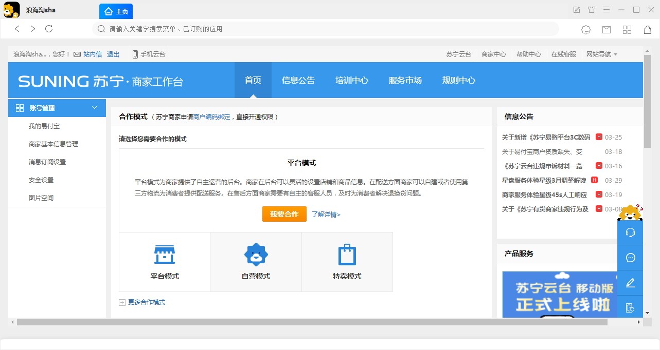 2、完成软件登录后进入苏宁商家工作台首页进行相关操作