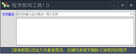 程序禁网工具是一款很简单的软件禁网工具,用于禁止各种软件连接网络,防止部分软件自动更新或私自上传用户数据;有许多软件很很实用,但它的安全却得不到保障,它们可能会悄悄上传用户数据造成用户的隐私泄露;如果非要使用这样的工具但又不想让它上传数据的可以使用该工具禁止它们连接网络,当然这只针对不需要网络也可以正常使用的程序;程序禁网工具支持软件拖放,可以直接将需要禁止联网的软件拖到软件中执行禁网操作;它不限制软件的添加数量,您可以添加多个软件到该工具中使其无法联网。