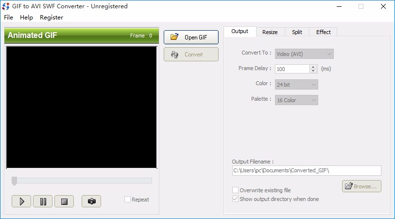 Converter是一款非常简单且实用的GIF转AVI/SWF格式转换器,提供强大的转换功能,可帮助用户快速将GIF文件转换与输出为AVI/SWF文件,GIF文件添加至软件后即可自动按帧进行播放,选择输出格式并设置好输出目录后一键即可进行转换,除了能够转换文件格式以外,还支持调整视频尺寸,包括设置宽度、高度等,同时支持GIF动画分割以及为视频添加特效,从多方面满足您对视频处理的不同需求,以适应于不同的使用场景,使用起来非常方便,需要的话就赶快下载吧!
