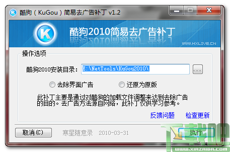 酷狗近期的更新比较频繁,而且又加入了新的广告,之前的补丁无法干净的去除,加之以前的补丁后广告被还原的问题时有出现,所以抽时间做了一点点测试和改进,补丁于昨日完成,在Win7下配合酷狗2010 6.1.25版通过了一天的测试。