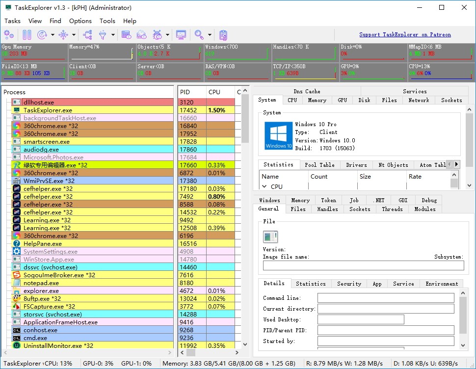 该应用程序的系统监视器方面也得到了很好的开发。工具栏提供了大小合适的图形,不仅提供CPU使用率,还提供对象,句柄,网络和IO /磁盘访问的使用率。