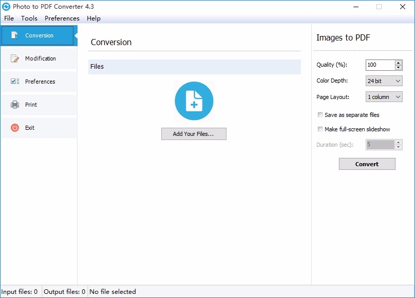 Converter是一款非常专业且优秀的照片转PDF转换器,顾名思义通过这款软件可帮助用户快速将照片文件转换与输出为PDF文件,软件界面虽然为全英文界面,但是丝毫不影响简单的操作,只需添加照片文件,设置输出文件相关参数以及输出目录后一键即可进行转换,若您对输出的PDF文件不满意,可对指定的文件进行修改,包括添加水印,加密,旋转页面等,从多方面满足您对PDF文件处理的不同需求,以满足不同的场景需求,同时支持打印,这么好用的软件赶快下载试试吧!