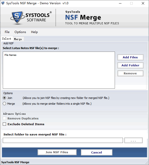 该软件提供了多个合并NSF文件的选项,例如Join&Merge。