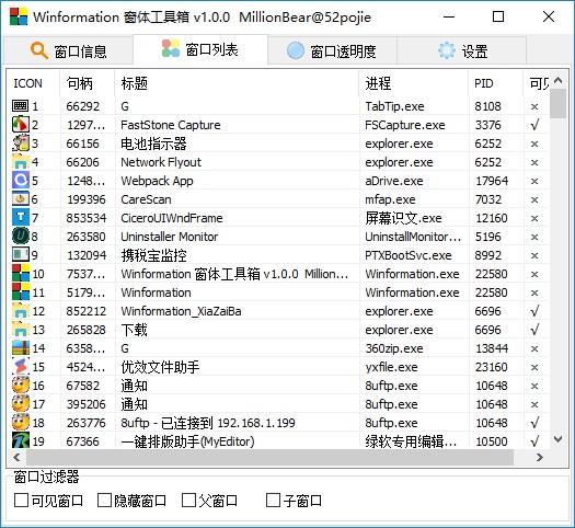 Winformation可以对程序窗口信息进行修改的窗体信息修改工具,使用这款软件用户可以对选择的程序进行窗口信息修改,用户只需选择程序然后鼠标右键即可对该程序的窗口信息进行查看,可以对窗口进行显示隐藏以及窗口透明度、标题、图标等进行设置;Winformation体积轻量、简单易用,通过该软件用户可以选择的程序进行结束进程自己定位程序文件位置等操作,便于用户对管理的程序进行操作,非常简单方便,有需要的用户可以下载使用。