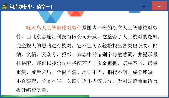 啄木鸟人工智能校对软件是一款非常专业且优秀的汉字校对软件,该软件由北京点连汇科技有限公司开发,整合了人工校对的逻辑,完全按照人的思路和逻辑对文档内容进行校对,您只需导入需要校对的文档一键即可进行校对,校对完成后即可将出错的文字进行标红显示,让这些出错的文字内容更加显而易见,还可查看其对应的出错原因并提供对应的建议词,不但可以轻松找出各类出版物、网站、文稿、报纸、杂志中的错别字与敏感词,还可以找出句中搭配不当、语序不当、用词不当、指代不明、语意重复等成分,对这些不当成分进行规范化,从而能够有效提升编校质量,欢迎有需要的用户下载体验