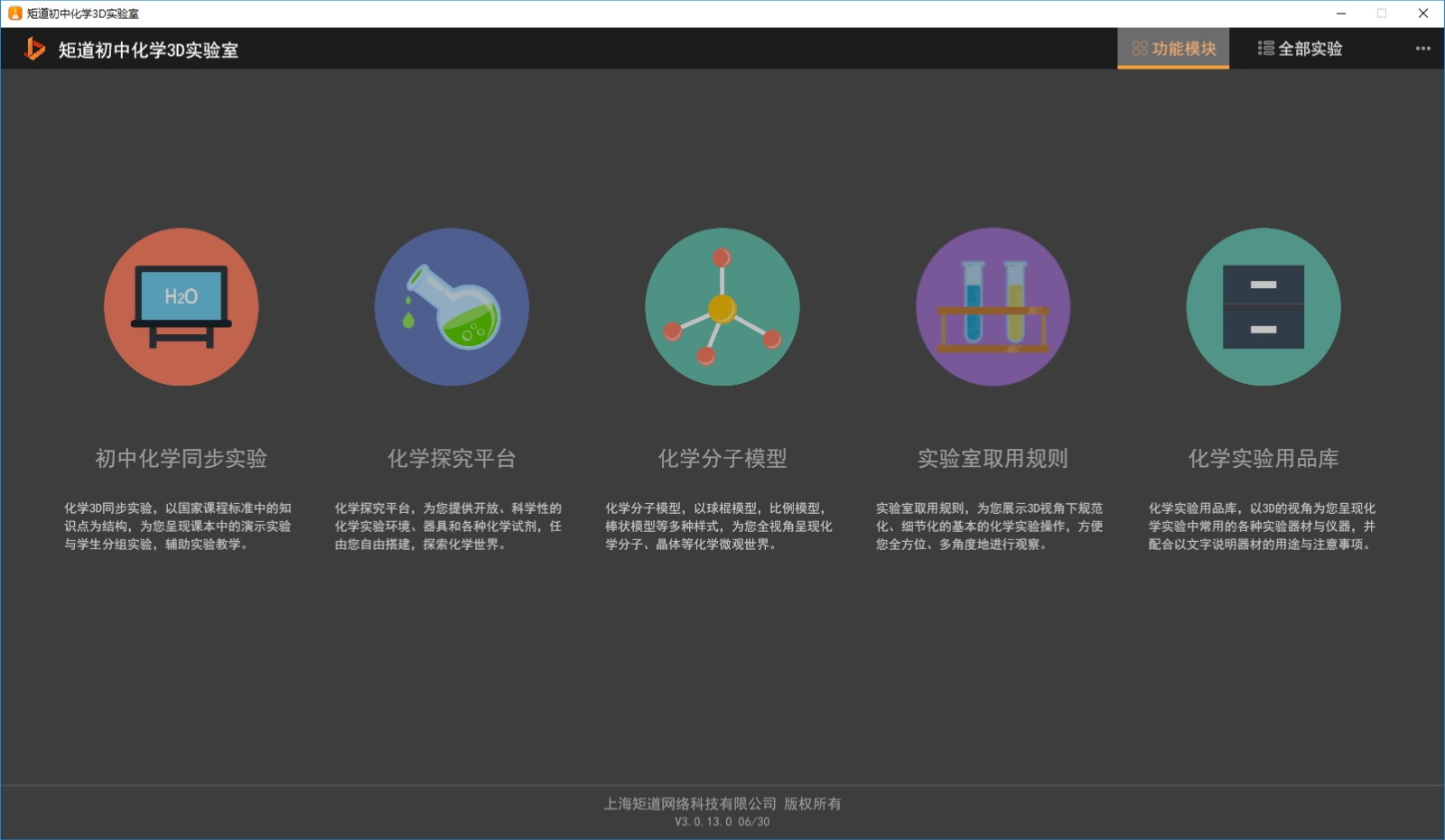 3、双击软件即可进入矩道初中化学3D实验室功能选择界面,点击即可进入实验