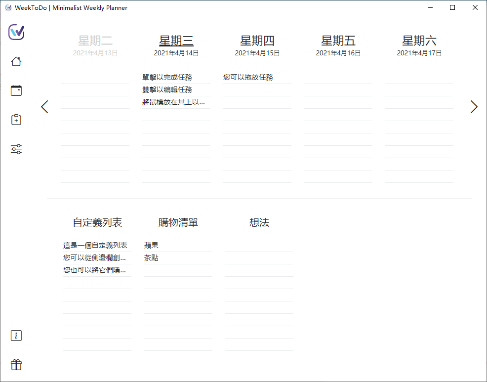 WeekToDo是一款免费的周计划管理软件,用户可以使用这款软件制定和管理自己一周的工作计划,当然对学生来说也可以用来管理自己的学习计划;做任何事情之前如果都有一个计划,那么在执行这项工作的时候就不会显得很仓促;不少自律的用户有制定月计划和日计划的习惯,而对大多数人来说,月计划的时间比较长,期间可能会出现很多变故,而日计划的意义其实并不大,这样看来周计划是最为合适的,所以推荐这款工具给大家;这款周计划管理工具能够满足用户对学习计划或工作计划的制定需求,它拥有简洁直观的用户界面,良好的操作方式,并且支持繁体中文,使用起来会很方便。