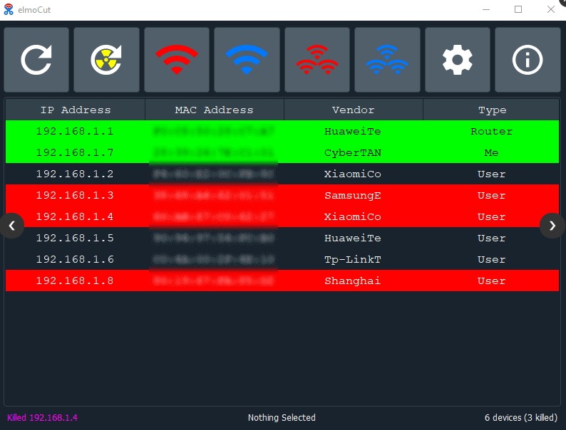elmoCut是一款体积轻量、专业实用的网络控制软件,通过该软件用户轻松管理连接的设备,对设备的网络进行管理,例如网络开启和禁用,连接设备的上传下载下载等,进一步降低CPU和RAM的使用率,让用户可以最大化的合理使用电脑,可让所有用户都能轻松地进行arp工作;elmoCut界面简洁直观、操作简单便捷,可对设备进行扫描连接,可对连接的设备信息进行显示,便于用户对设备进行管理,非常的简单方便,有需要的用户可以下载使用。