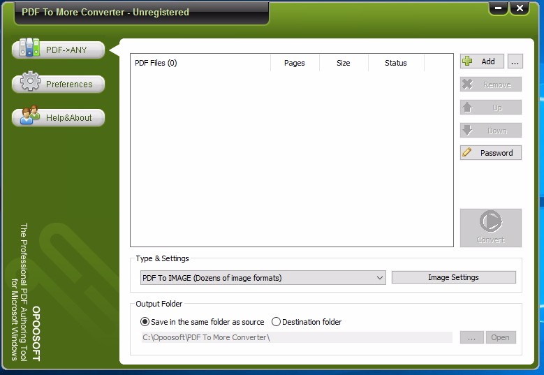Converter是一款非常专业且优秀的PDF文件格式转换器,提供强大的转换功能,可帮助用户快速将PDF文件格式转换与输出为JPG、BMP、PS、HTML、TEXT等各类常见的格式,软件界面简洁直观且对应的操作也非常简单,您只需添加需要的PDF文件,随后选择转换类型、输出格式以及设置输出目录,一键即可进行转换,提供了多种不同的转换类型,可对每种转换类型进行详细的设置,包括需要转换的页面范围,文件大小等参数,如果您需要这款软件的话就赶快下载体验一下吧!