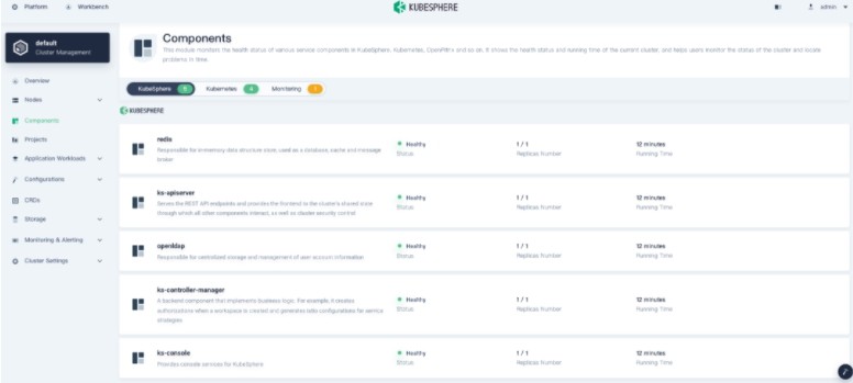登录控制台后,您可以在组件中检查不同组件的状态。如果要使用相关服务,可能需要等待某些组件启动并运行。您还可以kubectl get pod --all-namespaces用来检查KubeSphere工作负载的运行状态。