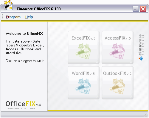 Cimaware OfficeFIX Pro是一个强大的文件修复软件,该工具主要用于修复损坏的Excel、access、Word和outlook文件;这四种类文件是们在日常办公中经常使用的文件类型,有时候我们会因为操作失误或计算机出现异常而导致这些文件损坏,如果用户没有提前备份这些文件的话,那么这款Cimaware OfficeFIX Pro将对恢复它们起着很大的作用;这款软件是一个多功能的文件修复工具,用户只需要安装这款一个软件就可以使用四种文件修复功能,这在一定程度上减少了用户计算机的内存占用,同时它采用向导式的操作方式,这对于新手或经验匮乏的用户而言是十分友好的。