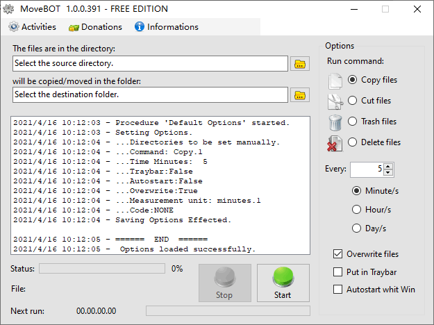moveBot是一个简单好用的自动化文件管理工具,通过配置可以让该软件在指定的时间内循环执行文件删除、文件复制和文件剪切等操作;自动化的文件管理方案可以提升用户的工作效率,而这正是这款工具所要实现的目标,虽然该软件目前所拥有的功能算不上强大,但在某些方面却对用户有很大的帮助,比如它可以在您下载文件后自动删除您不再需要的文件,将某些文件复制或移动到指定的路径中;这些都是用户在日常工作中经常会执行的操作,如果这些操作都由这款工具替代,那确实可以为用户节省不少的时间。