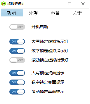 虚拟键盘灯是一款简单易用的键盘指示灯辅助工具,这款工具可与键盘上的指示灯同步,通过这款工具可以让用户直接在桌面上判断键盘指示灯的开关情况;这款工具虽然简单,但定制化功能却十分出色,您可以按个人喜好和需求选择指示灯的提示方式,开关颜色以及提示音效等;虚拟键盘灯默认显示数字键盘和大小写的状态,至于scrolllock则需要用户自行在设置面板中打开;总而言之,如果您打字时喜欢盲打的话,那么这款工具能够让您在桌面上直接判断键盘的大小写和数字键盘的开关状态。