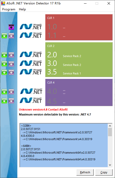 ASoft.NET Version Detector是一款.net版本检测工具,通过该工具您可以轻松在计算机上查看.net的版本信息;这款工具可以显示的信息包含.net的版本号、Service Pack、下载平台和安装路径等;当计算机中缺失.net或版本过低时,可能会导致某些软件无法安装使用,所以用户必须要到微软官方下载适合版本的.net以解决软件无法安装的问题;ASoft.NET Version Detector能够为用户提供直达.net下载页面的功能,使用该工具用户将减少在微软官网查找.net版本的时间;需要的朋友欢迎下载使用。