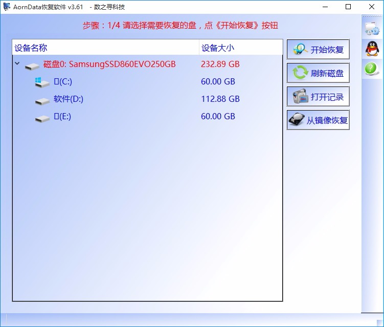 2、选择需要恢复的磁盘,并可查看不同磁盘的大小等信息