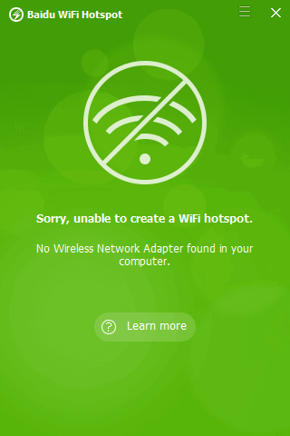 Baidu WiFi Hotspot翻译成中文是百度WiFi热点,但这款工具与百度没有任何关系,它是一个来自国外的WiFi创建工具;这款工具除了可以创建WiFi向用户提供无线上网功能外,它还拥有一个特色功能是支持与智能手机共享文件,并且不会区分手机的操作系统,也就代表无论手机是安卓还是iOS系统都可以通过它共享文件;与其他同类应用相比,Baidu WiFi Hotspot使用起来会更简单,不过它能实现的功能也相对较少,虽然这款软件不能完全替代路由器,但在路由器故障或在没有路由器的环境下您可以临时通过它实现无线上网。
