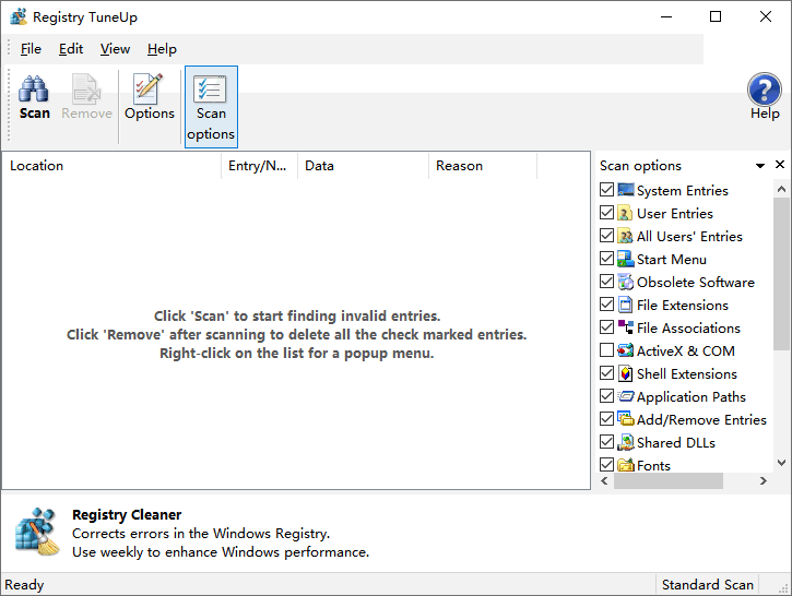 Registry Tune Up是一款注册表清理软件,旨在通过清理注册表以维护计算机的清洁和流畅运行;它是ACE软件的一部分,但它可以单独的安装运行;这款出色的软件能够帮助您快速扫描所有注册表并查找所有错误或无效注册表条目,它会将所有无效的注册表条目直观的显示在软件窗口中,您可以按自己的需求决定要删除哪些条目;Registry TuneUp可以检查无效的ActiveX,程序路径,独立或无用的dll文件,字体,开始菜单,文件扩展名等数据;对于高级用户,该软件还提供了注册表筛选功能,让用户能够更灵活的选择注册表进行清理。