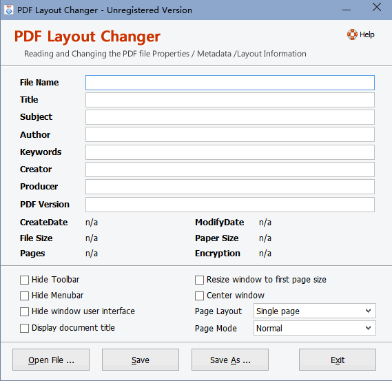 PDF Layout Changer是一款简单易用的元数据修改软件,用户可以使用这款工具修改PDF文档的元数据信息和启动项功能,比如您可以自定义文档窗口启动时的尺寸,窗口的摆放位置以及是否隐藏任务栏等等;这款工具较为简单,直接将需要修改元数据的PDF文档添加到软件中就可以修改;PDF Layout Changer允许用户修改PDF文件的作者、标题、主题以及关键字等信息,完成修改后用户可以将修改的文档另外保存,这样可以避免源文件中的元数据信息改变;需要的朋友赶紧下载吧。