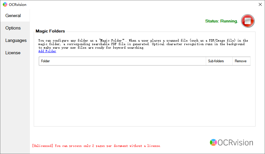 您可以将OCR文件放在特定的文件夹中,也可以对其进行配置以在其子文件夹中包含文件。如果还要监视子文件夹,请选中“子文件夹”复选框。您可以随时单击“魔术文件夹”旁边的小红叉按钮,然后从OCR监视的文件夹列表中删除该文件夹。