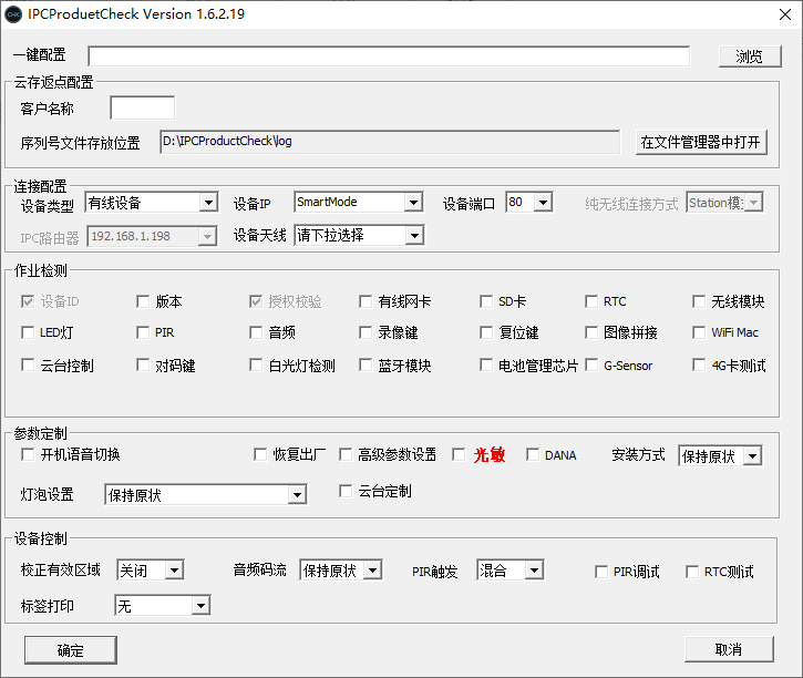 IPCProductCheck是一款设备检测工具,可用于纯无线设备、有线设备、IPC路由器、打印机等成品的检测;这款工具可以对设备的LED灯、PIR、音频、录像健、复位键、图像拼接、云台控制等项目进行检测,用户可以自定义配置检测方案,也可以选择软件提供的配置文件进行检测;IPCProductCheck适用于各种网络设备的检测,可以检测的项目非常丰富,配置方式也很简单,需要的朋友欢迎下载使用。